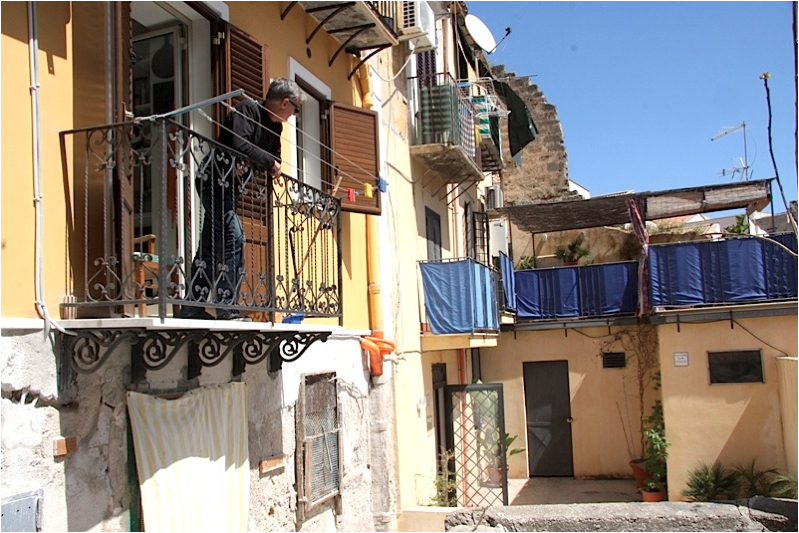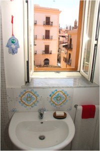 The flat is entered on the ground floor and a short flight of four steps takes you into the lovely first floor bijou of a home. There you enter 50 sq meters (circa 160 sq feet) where, from the balcony you see Palazzo dei Normanni. It is full of light, airy, and in a quiet neighborhood interrupted by the sounds of mothers calling their children or occasionally letting their husbands know how upset they are…
